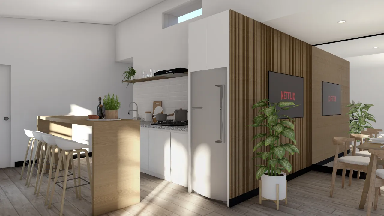 Kitchenette con Barra: Cocina contemporánea que combina estilo y practicidad, perfecta para reuniones o comidas informales.